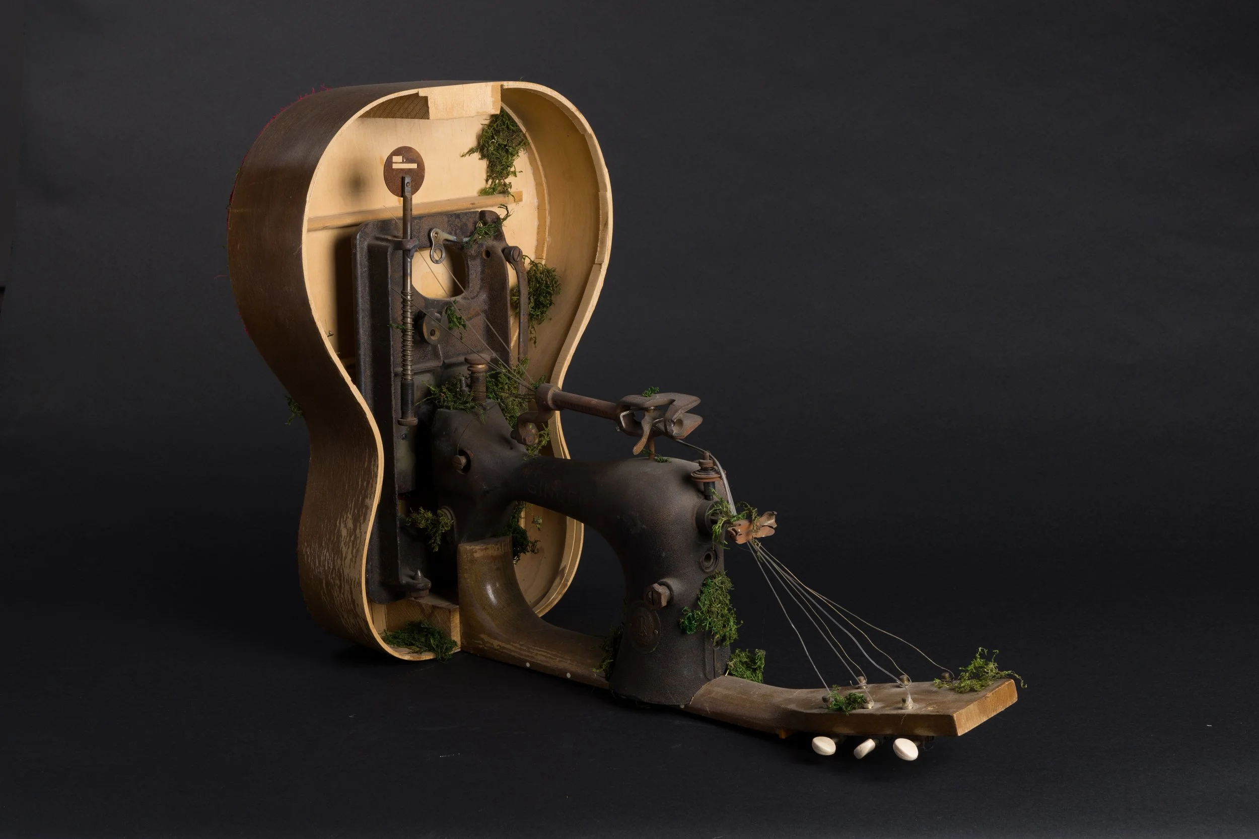 Meet Lola.She is created from a damaged guitar and a cast iron sewing machine. These represent my grandmothers love for music and her talent as a seamstress that continues to grow even today.